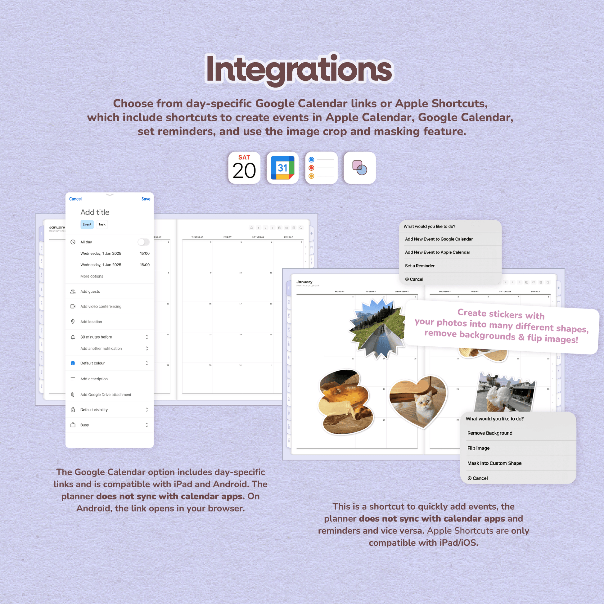 • Option 1: Apple Shortcuts for Google Calendar, Apple Calendar, and Reminders (does not sync automatically). Includes image cropping, background removal, flipping, and masking into 110 custom shapes to turn photos into stickers