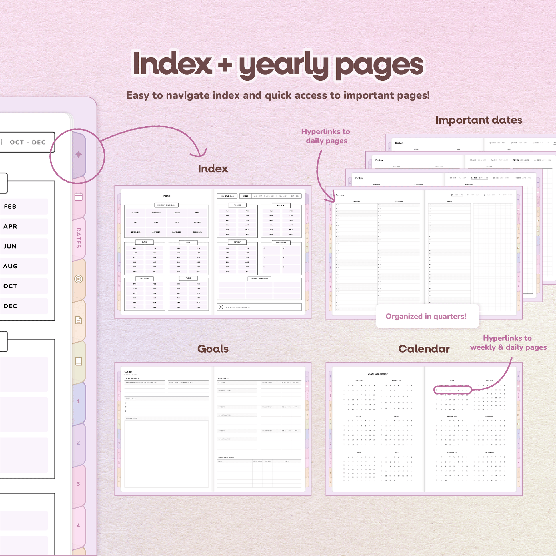 • Yearly: Calendar with hyperlinks, quarterly important dates, yearly goals