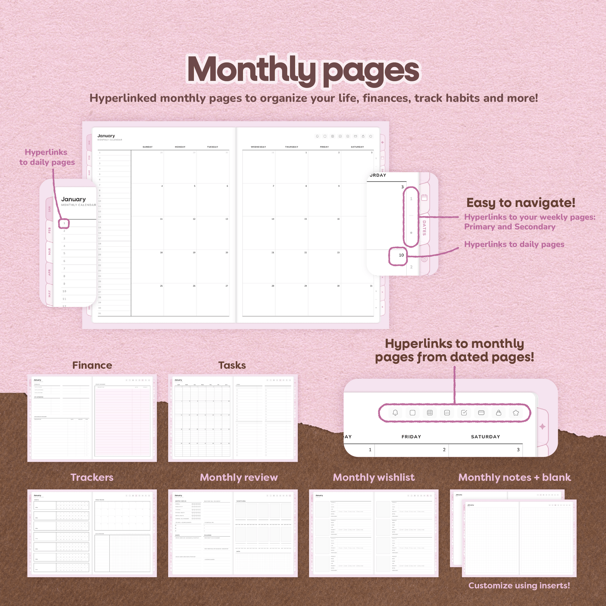 • Monthly: Calendar, habit/mood/custom trackers, finance, monthly tasks, monthly review, wishlist, notes, blank page