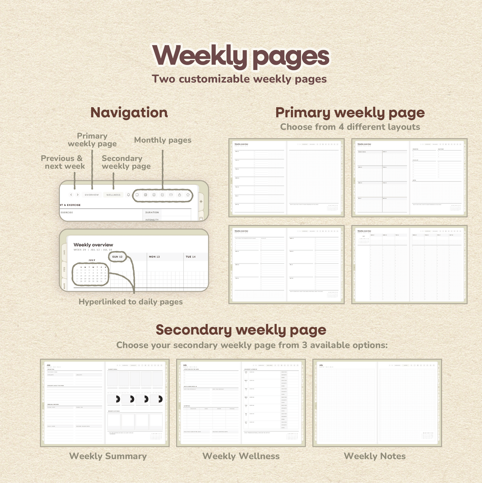 • Weekly: 4 primary layouts + 3 secondary layouts (choose your preferred template)