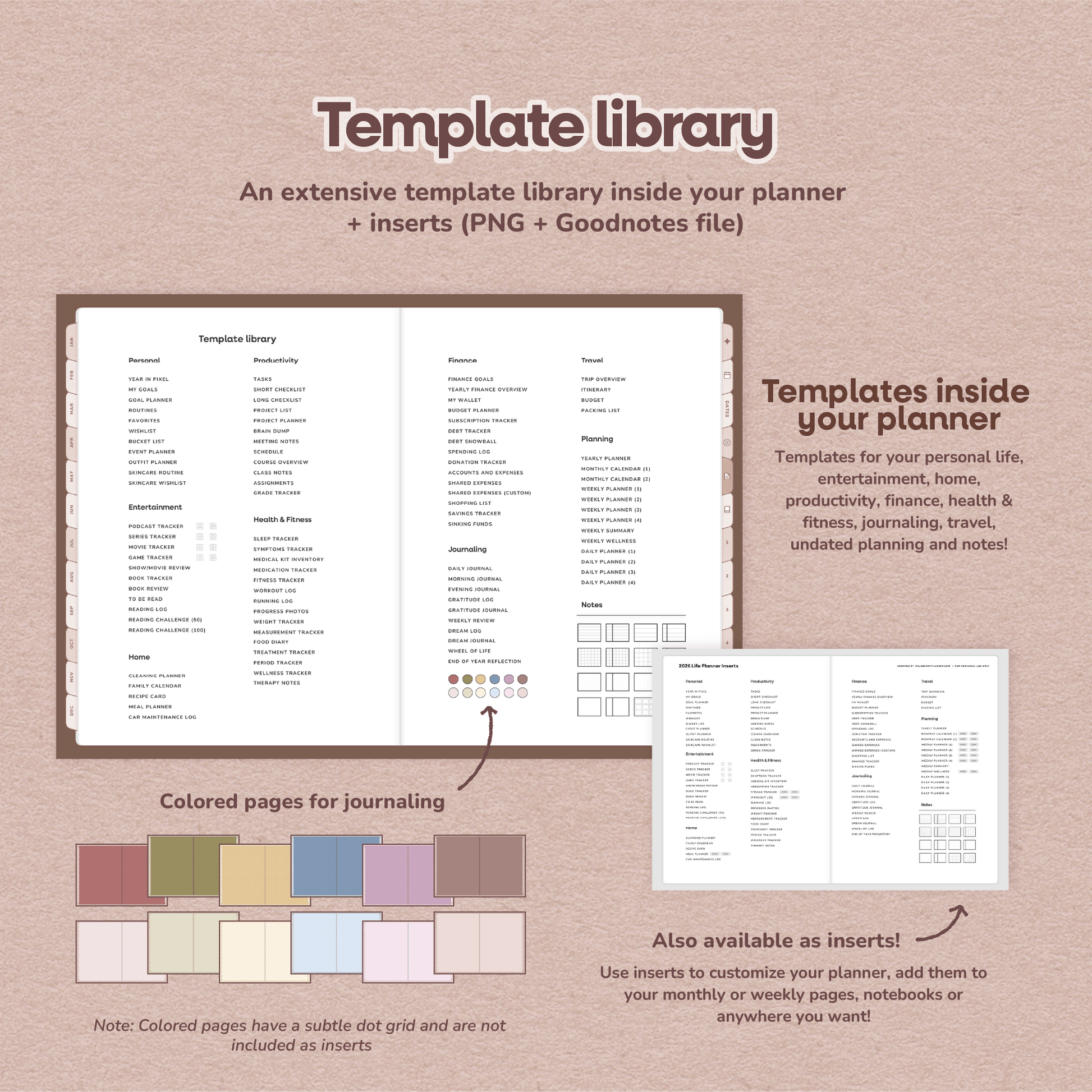 • Template Library: Personal life, entertainment, home, journaling, health and fitness, finances, travel, productivity (also available as inserts)