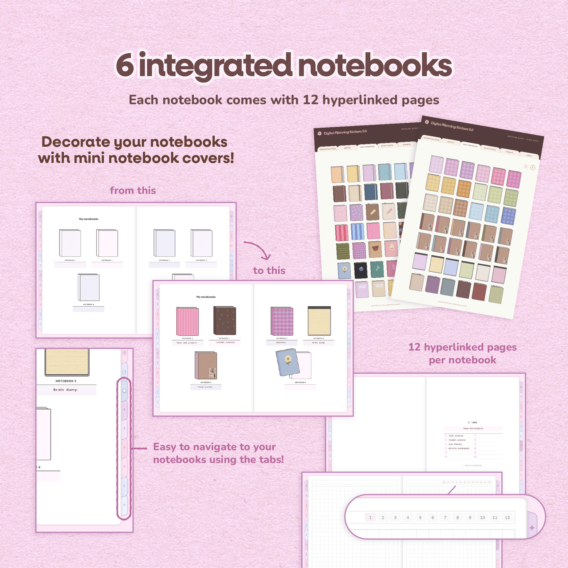 • Custom Notebooks: 6 integrated notebooks, each with 12 hyperlinked sections