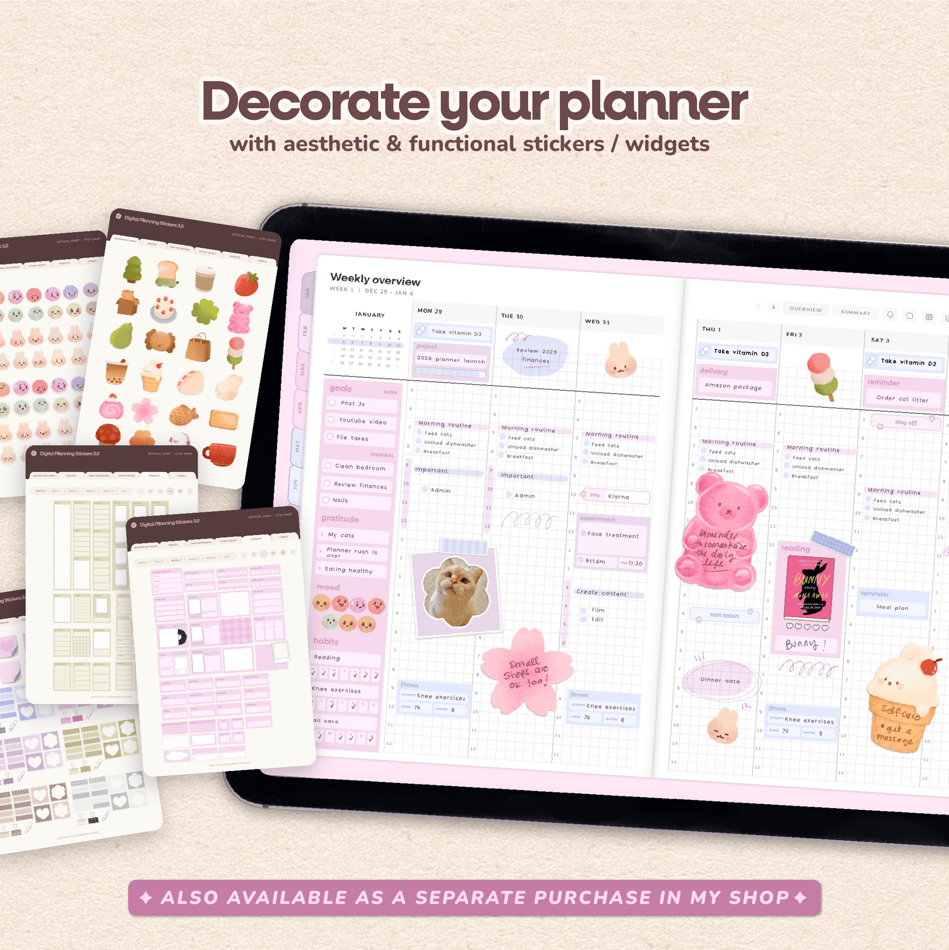 • 2,000+ decorative stickers: memos, emotes, mini notebook covers, widgets (6 colours)